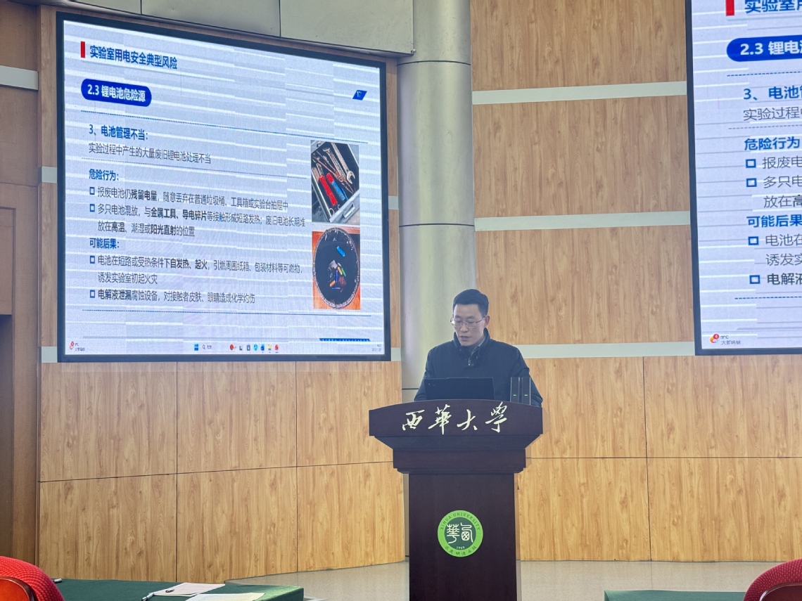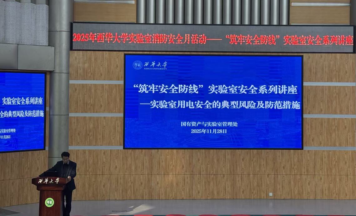 为切实提升师生实验室用电安全意识,夯实校园安全防护基础,2025年11月28日上午,西华大学国有资产与实验室管理处在四教报告厅组织开展了“实验室用电安全的典型风险及防范措施”主题讲座。活动特邀电气与电子信息学院实验中心主任孙章高级实验师担任主讲,面向全校实验室教师队伍及新入学研究生进行系统培训。